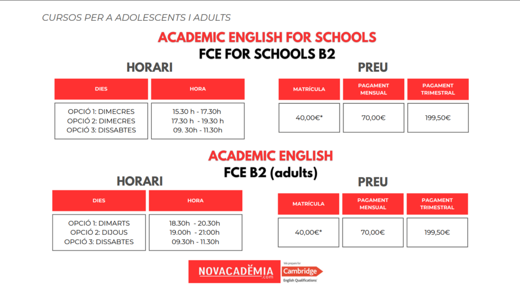 NOVACADÈMIA et fa una prova de nivell oficial i una entrevista personal abans de l’inici del curs, que ens permet segmentar els grups per nivell i no per edat en el cas de joves i adults. A final de curs, es fa una prova de nivell final completa que ens permet analitzar i comprovar la teva evolució i el nivell del teu rendiment dins el Marc Comú Europeu de Referència de les Llengües.També et prestem un servei professional d’assessorament en relació amb els exàmens oficials de CAMBRIDGE ENGLISH, i disposem de materials oficials per practicar les diferents parts i proves de l’examen FCE o FCE for Schools abans de presentar-t’hi oficialment.Si vols més informació sobre aquest nivell, pots contactar amb nosaltres aquí.