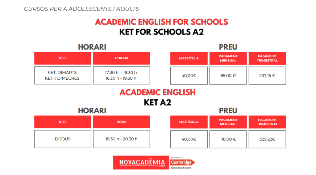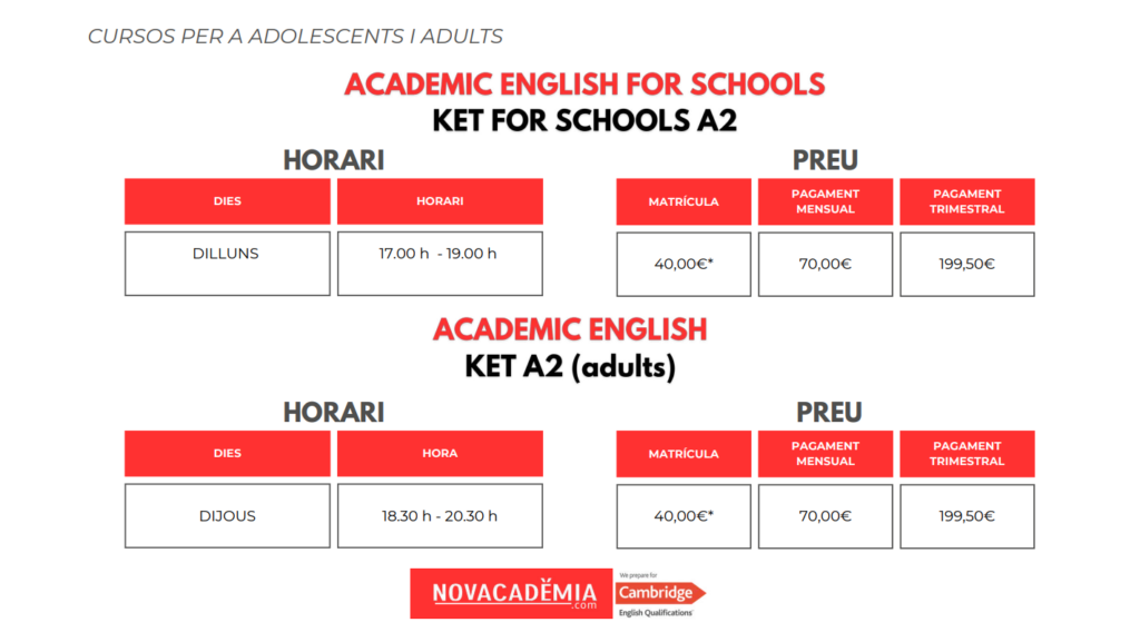 Els alumnes adults amb nivell iniciació o bàsic, cursen a NOVACADÈMIA el nivell KET A2 en dos cursos. El primer dels quals està orientat a endinsar l’alumne dins l’aprenentatge de la llengua, partint de 0. D’altra banda, el segon curs, serveix per consolidar el nivell i preparar l’alumne per al següent nivell, el Preliminary English B1.