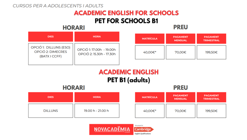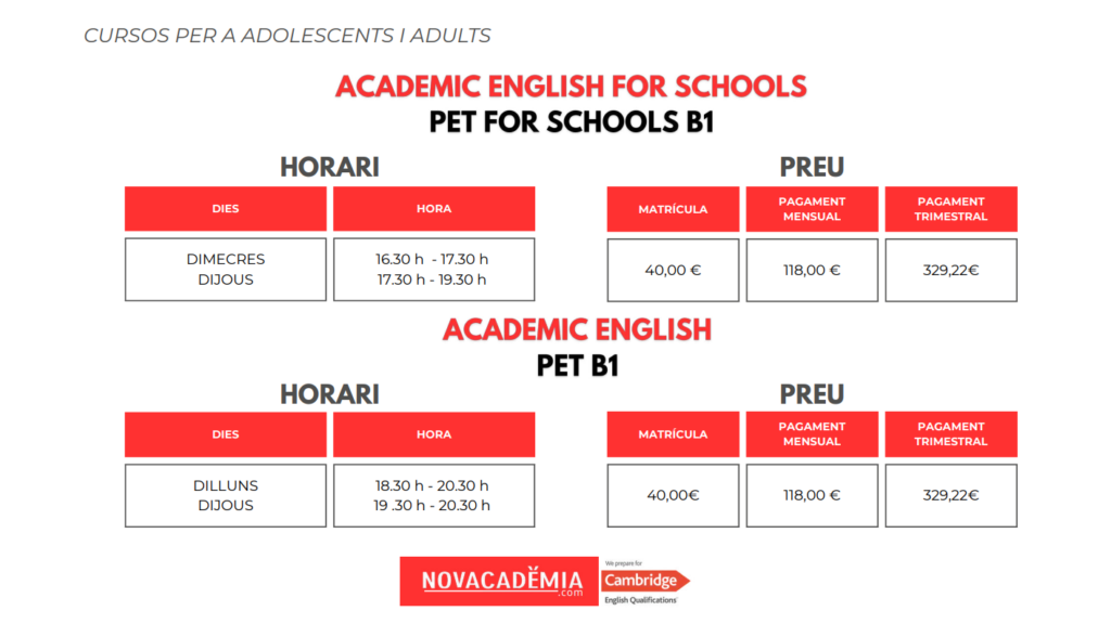 NOVACADÈMIA segmenta els seus alumnes en nivell PET B1 en funció de si són adults o adolescents, impartint els cursos d’acord amb els continguts genèrics o els específics per a adolescents respectivament. Quan els alumnes assoleixen el nivell PET B1, se’ls recomana presentar-se als exàmens oficials que certifiquen davant de qualsevol requisit d’entitats públiques i privades, el seu domini de la llengua anglesa en nivell Preliminary B1.Habitualment aquest nivell es cursa en dos cursos de setembre o juny, o amb un curs de setembre a juny i un intensiu al juliol. En la majoria dels casos, el factor que indica quin és el temps que l’alumne necessita abans de passar a nivell B2, està relacionat amb les mateixes capacitats de l’alumne, el temps extra que dedica a la llengua fora de l’aula i la seva base d’anglès inicial.